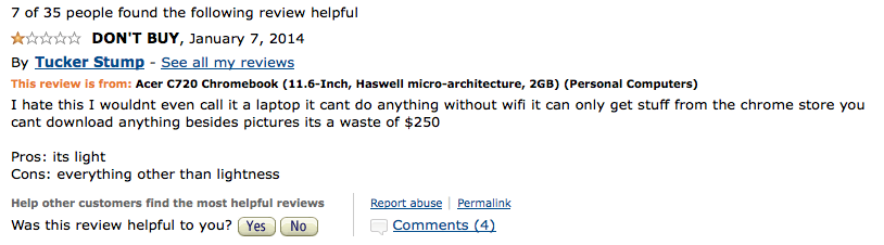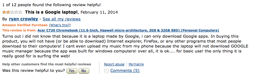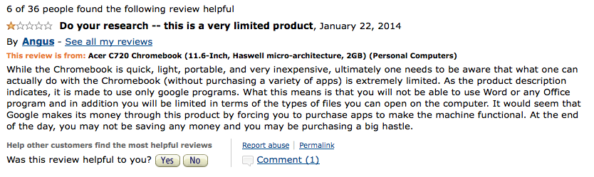 What follows are a selection of negative reviews of Chromebooks posted by Amazon users. This article isn’t intended to poke fun at the reviewers, for while they clearly didn’t pay attention to what they were buying (Amazon listings for Chromebooks are very comprehensive) their experiences are valuable in learning where Chrome OS and its features fail.